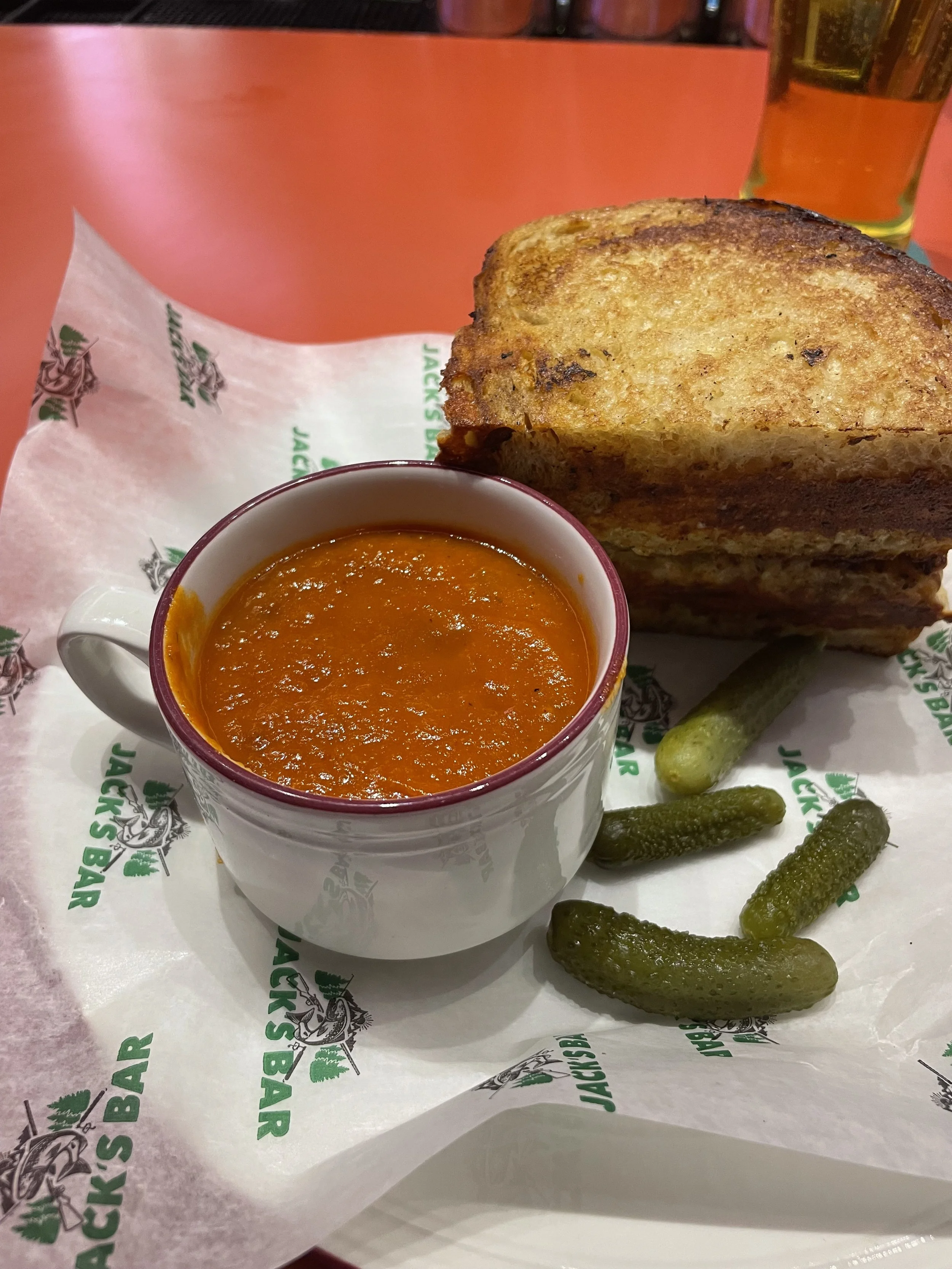 I returned to the bar at the exact moment my food arrived. Given my aforementioned opinion on tomato soup, my expectations were quite low. After one brief glimpse at my plate, I grew even more pessimistic. A demitasse cup filled with what looked like an affront to spaghetti sauce neighbored a stack of two thick grilled cheese halves. Begrudgingly, I lifted up my spoon and tried the “soup.” Immediately, I recognized the familiar taste of mediocre marinara sauce that one could acquire at their local pizza shop or convenience store. I willingly took the liberal approach and counted this sauce as soup, but in no reality or the Upside Down could classify it as good soup. The occasional bits of tomato and added garlic amplified it slightly, but it felt impossible to escape the feeling of myself just feasting on a cup of dipping sauce. A couple of spoonfuls later, I imagined how the conversation likely transpired for the origin of this tomato soup.