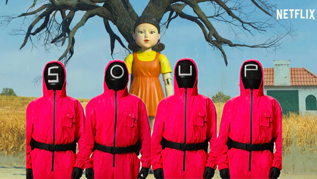 I took a seat at the fittingly-colored red-and-white-glowing bar. I ordered a lager and grinned as the beer was placed on a coaster featuring the guards’ helmet shapes in Squid Game. I grabbed a menu resting half-open to my left and glanced through it. For someone who’s only watched one season of Stanger Things and a handful of the other premier series on Netflix over the past few years, I did fairly well at recognizing show references by just reading each item’s corny description. However, I had no clue what Preacher’s Classic Grilled Cheese & Tomato Soup was referencing. Utilizing the research skills I gained in grad school, I discovered on Google that there’s apparently a show, currently in its seventh season, named Virgin River that features a character nicknamed Preacher. For those wondering, the item’s description did not mention the popping of cherry tomatoes in their preparation of the soup. Since it was the only soup on the menu, I ordered it, but I was astonished there was just one option, especially given the plethora of soups cameos in Netflix shows.