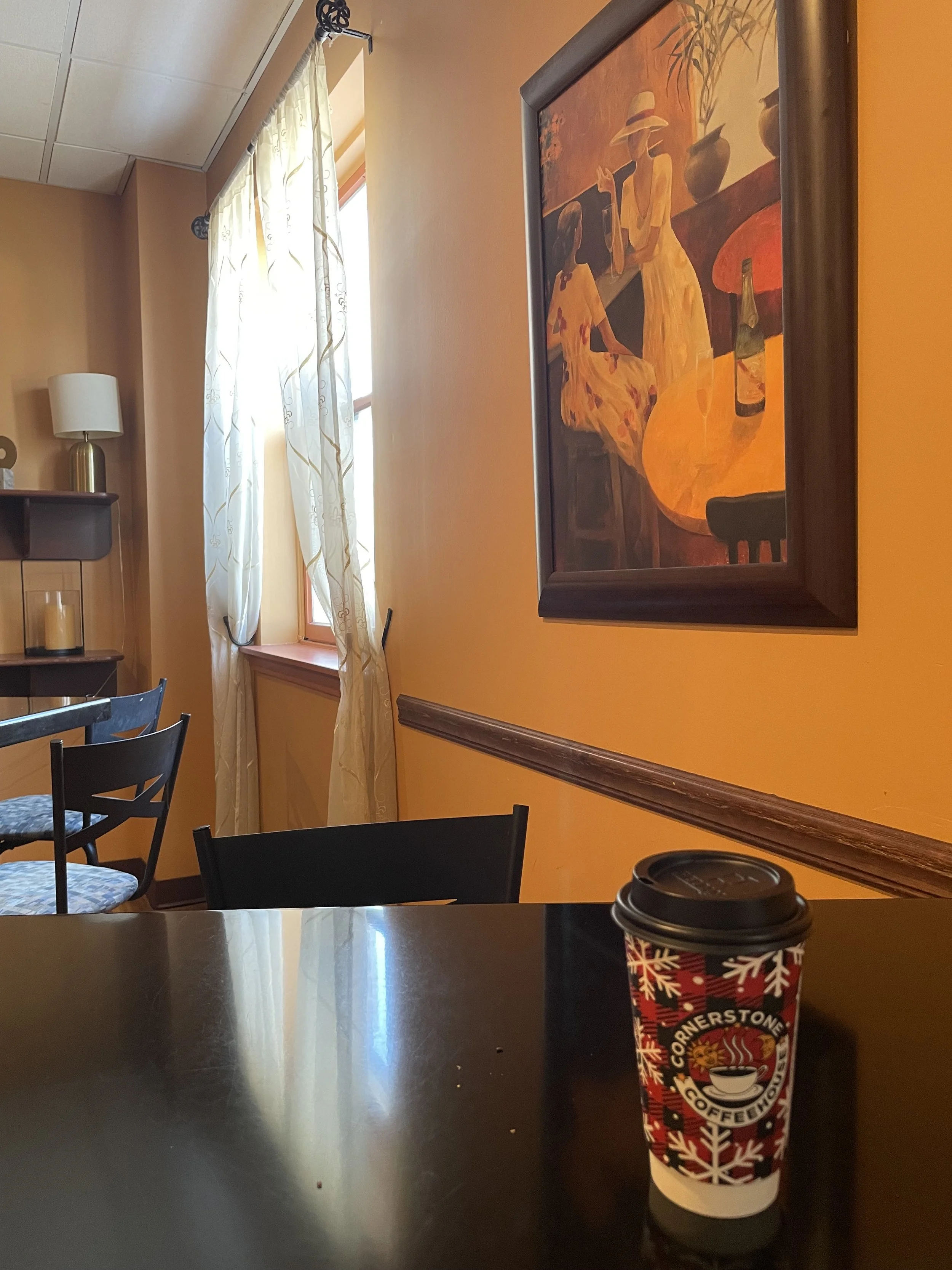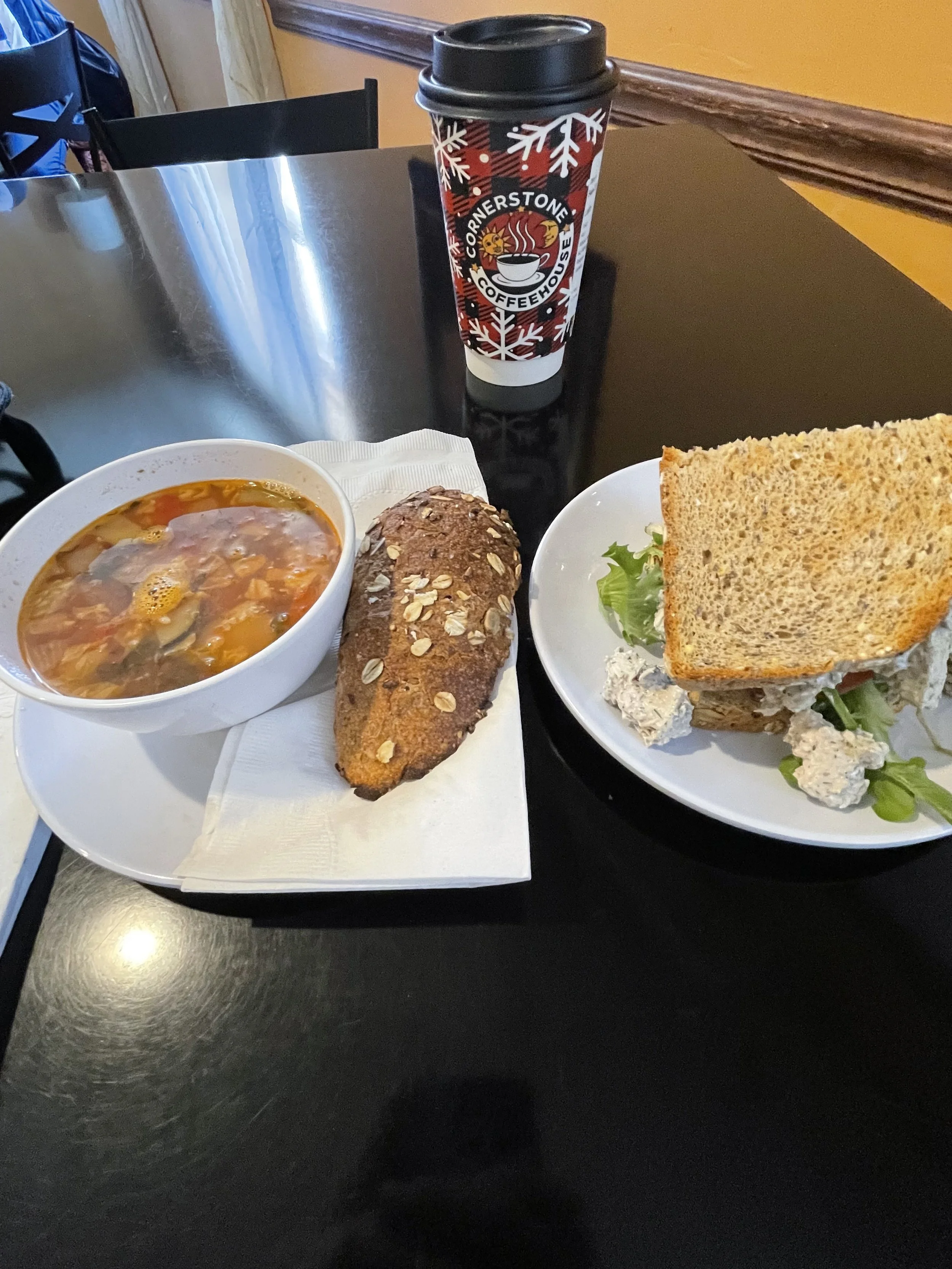 Cornerstone has two sitting areas that represent two distinct coffeehouse vibes. The front area by the register features more hustle and bustle as old friends catch up, orders get called out, and the local high schoolers walk in to enjoy their lunch hour of freedom. I opted for the back area which has more of a laid-back atmosphere that generates the perfect writing conditions for one to pen the next literary masterpiece or just type up a blog about soup. The back area also includes a kitchenette that is utilized for culinary classes and a warm Dijon yellow color that covers the walls. This immersive paint transported me to 19th century France. Perhaps in a past life, I was a soldier roaming the French countryside where I took a brief moment to get away from the brutal nature of the war I was fighting in to walk inside a random house’s salon and admire a piece of art that looks similar to the one that I am eating soup in front of today. Two realtors obnoxiously discussing how they unethically acquire leads brought me back to the present.