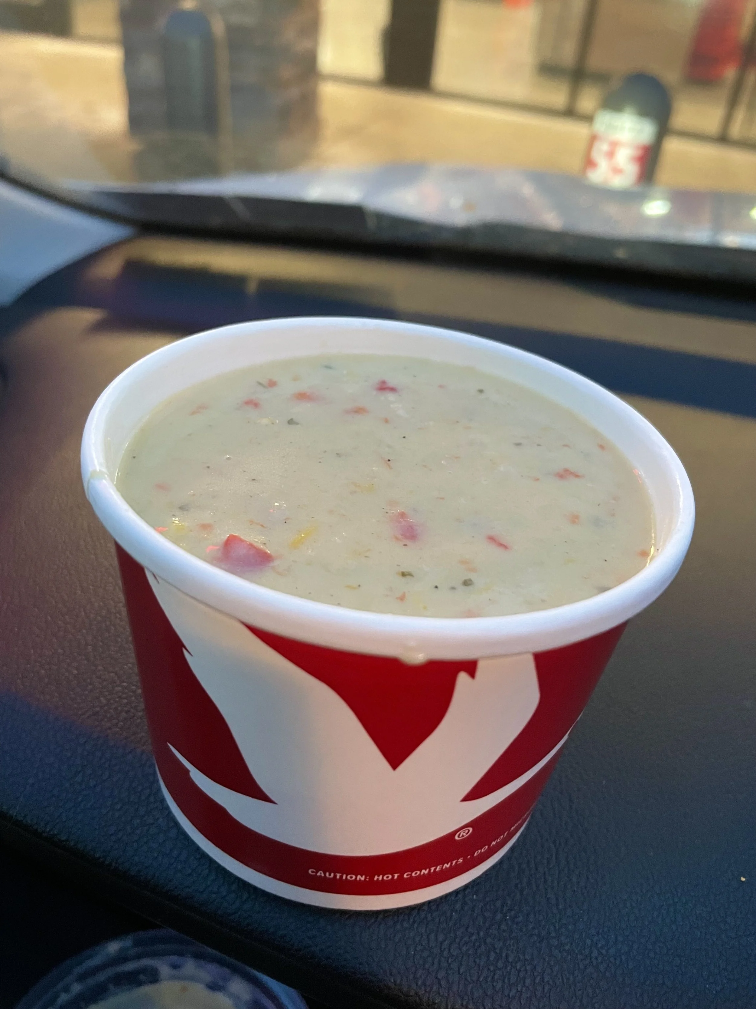 A twenty-minute commute brought me to Wawa, the third most popular spot in Enola on a Friday evening. The top two of course being Al’s Pizza of Enola, the town’s watering hole, and the Pennsylvania Department of Transportation’s Driver’s License Center, the town’s premier location for wanting to put a hole in your head. Fortunately, most of the fine people of Enola only needed to get gas or some form of tobacco, so it didn’t take long to access one of the self-ordering kiosks. With it only competing against chicken noodle and chili, the chicken corn chowder easily separated itself to become the choice for the day. I ordered a medium sized serving that set me back five bucks and 320 calories.